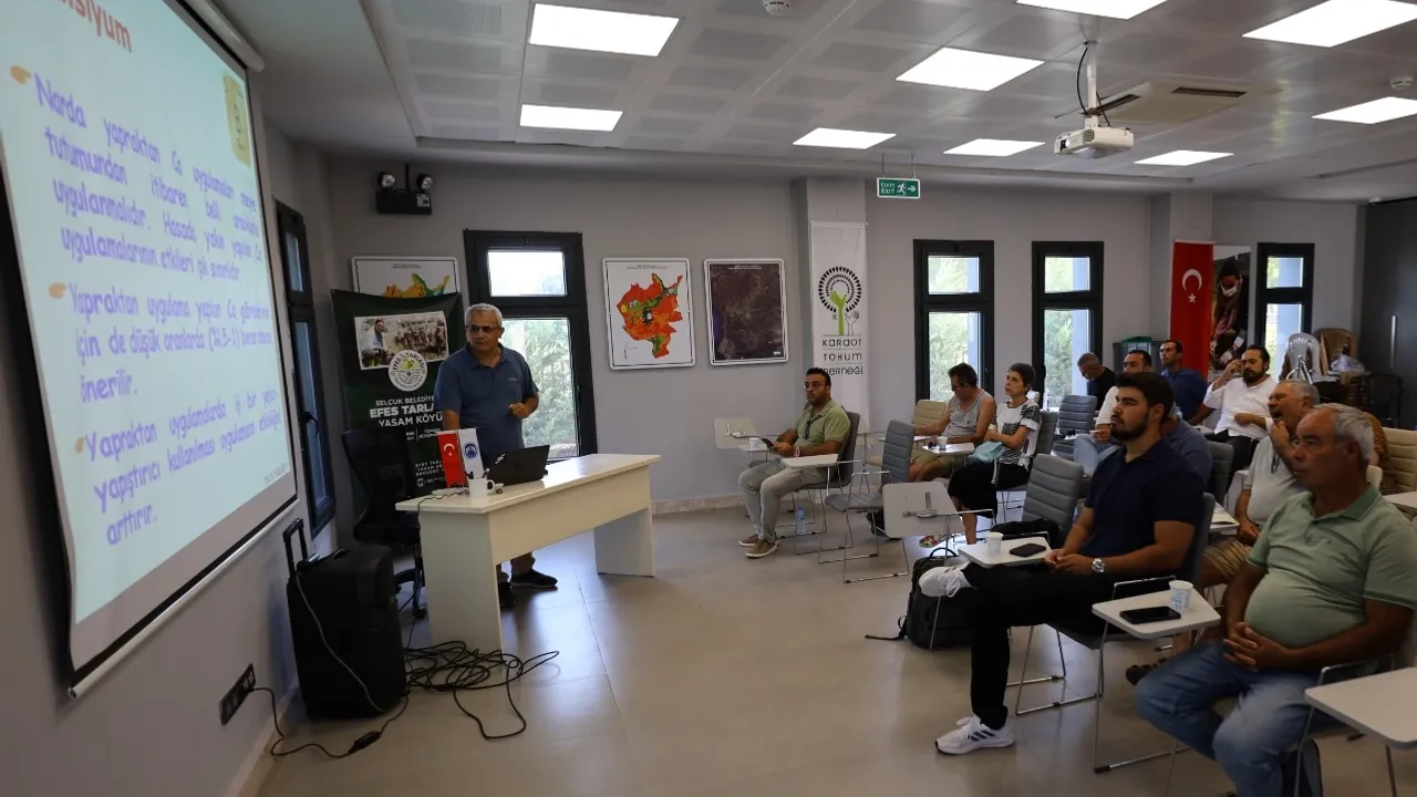 Ege Üniversitesi'nden Prof. Dr. Fatih Şen ve Çukurova Üniversitesi'nden Prof. Dr. Okan Özkaya’nın konuşmacı olarak katıldığı eğitimde Efes Selçuk’un önemli ihracat ürünlerinden olan narın hasat ve depolama sürecindeki kayıpların önlenebilmesi için dikkat edilmesi gereken unsurlara dair üreticilere bilgi verildi.