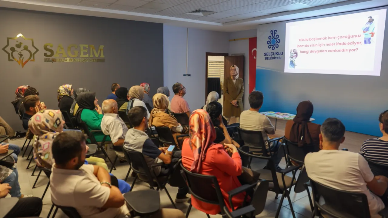 SAGEM okula yeni başlayacak çocukların uyum süreçlerini kolaylaştırmak amacıyla ebeveynlere yönelik “İlk Zil, İlk Adım Okula Uyumda Ailenin Rolü” konulu seminer düzenledi. Veliler 4 gün boyunca devam eden seminerlere oldukça yoğun ilgi gösterdi.KONYA (İGFA) - Konya'da Selçuklu Belediyesi tarafından ilçeye kazandırılan ve toplumun temel taşı olan aile kurumunun yapısını güçlendirmeyi hedefleyerek kurulan Selçuklu Aile Gelişim Merkezi (SAGEM), ailelerin gelişimini desteklemeye yönelik eğitim programları ve seminerlere devam ediyor.